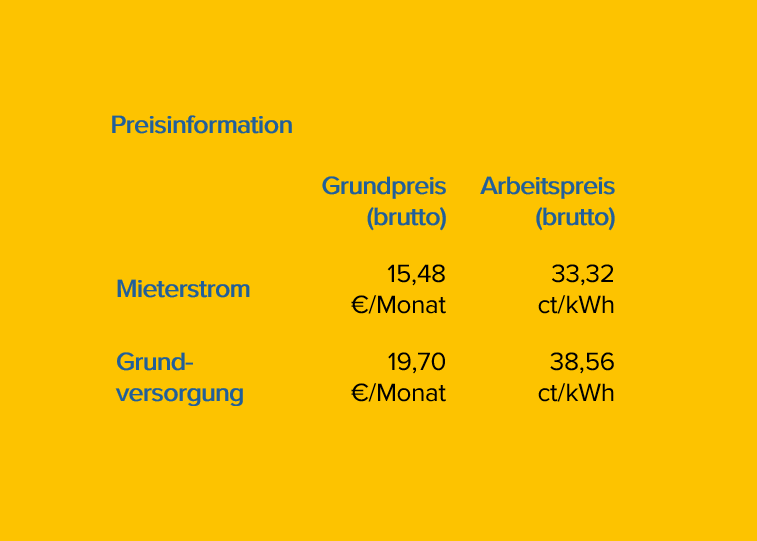 Die Photovoltaik-Anlage (PV-Anlage) auf Ihrem Dach nutzt die Strahlungsenergie der Sonne und erzeugt daraus CO2-neutralen Strom, der direkt im Haus durch Sie ver-braucht wird. Dieser eigenproduzierte Solarstrom wird als Mieterstrom bezeichnet. Somit profitieren auch Sie als Mieter von günstigen Erneuerbaren Energien.