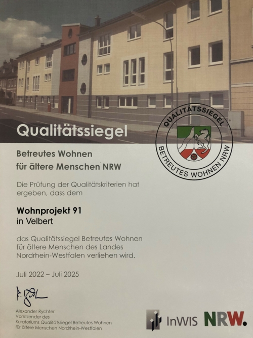 Der spar+bau und sein langjähriger Kooperationspartner, Pflegedienst Lange aus Velbert, konnten nun über das Kuratorium Qualitätssiegel Betreutes Wohnen NRW für das mehrstufige Wohn– und Pflegeobjekt Langenberger Str. 91 in Velbert die Auszeichnung bis zum Sommer 2025 verlängern lassen.