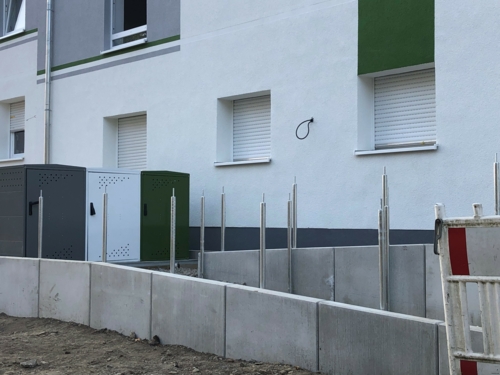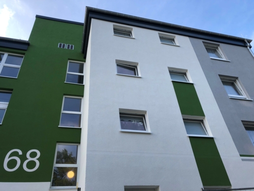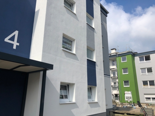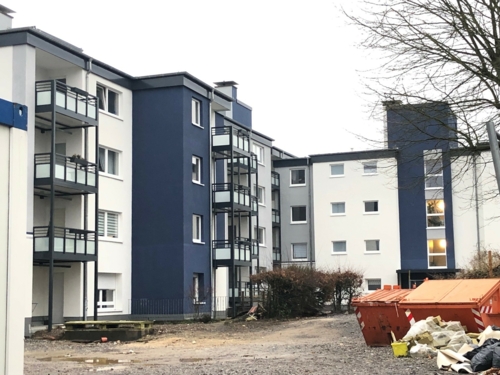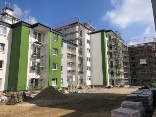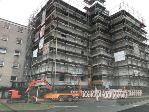 Seit einigen Monaten erstrahlen die Häuser An der Mähre 2-6 in neuem Glanz (s. Foto). Der erste Bauabschnitt ist damit so gut wie abgeschlossen, lediglich die Außenanlagen müssen im Frühjahr noch neu angelegt werden. Damit sich aber auch die übrigen Mieter des spar+bau im Quartier bald über Energieeinsparungen durch neue Fenster, Fassadendämmung mit nachhaltiger Mineralwolle und die neue Heizungsanlage bzw. über die neuen, größeren Terrassen und Balkone freuen können, gehen die Arbeiten unvermindert im 2. Bauabschnitt weiter. Aktuell sind die Häuser Sternbergstr. 68+70 an der Reihe: Nach Abbruch der alten Balkone wurden die Häuser bereits eingerüstet (s. Foto) und erhalten derzeit ihre Fassadendämmung. In diesem und im nächsten Bauabschnitt (Höferstr. 12+14) werden aufgrund der großen Höhenunterschiede zwischen Gehweg und Haustüren für die Eingangsbereiche außerdem große Rampenanlagen notwendig, um die Gebäude rollstuhlgerecht sowie barrierefrei für Fahrräder, Kinderwägen o.ä. zu erschließen.